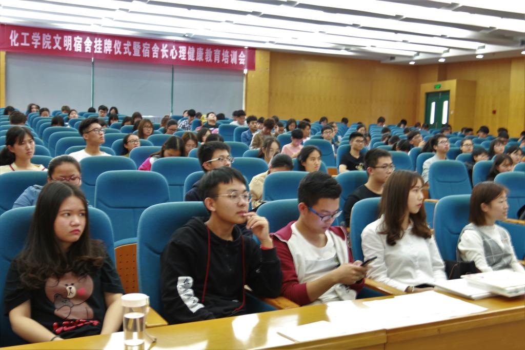 2018年3月28日,化工学院在王源兴国际会议中心G101举行文明宿舍挂牌仪式暨宿舍长心理健康教育培训会。会议邀请心理辅导中心王海荣老师为全体宿舍长开展培训。会议由辅导员徐慧主持。